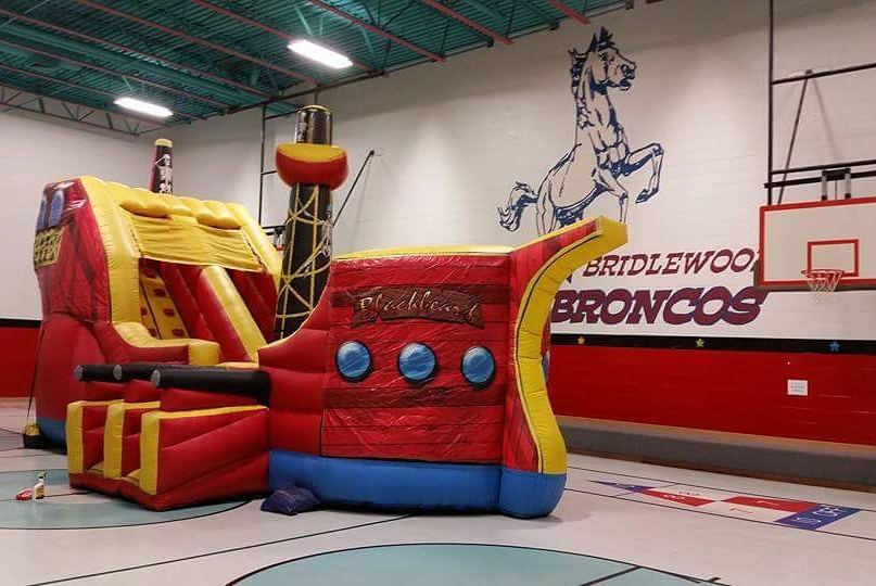 Ahoy Matey! The Pirate ship jump-n-slide combo fits perfectly with any pirate themed party. Resembling an actual pirate ship, this combination jump house is sure to impress guests of any age, even teenagers. This high capacity inflatable contains a jumping area, climbing wall, and a full size slide—perfect for any small or large scale event.