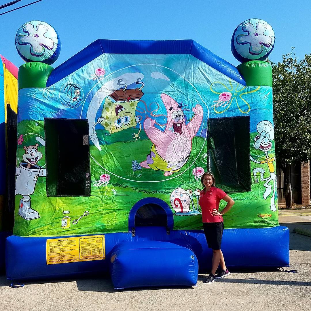 The SpongeBob 4-n-1 combination unit features SpongeBob and all of his pals. Children will spend hours enjoying this interactive unit, which includes a jumping area, basketball hoop, climbing wall, and slide. Licensed by Nickelodeon, this unit is sure to dazzle guests of all ages, with its beautiful customized SpongeBob banner that covers the entire 15 foot front side of the unit. The SpongeBob combination unit is perfect on a hot Texas day as it can be rented wet or dry, allowing kids to stay cool in the Texas heat. This unit is available for rent in North Dallas area. A Jump City professional will deliver this unique combination unit for your party or event. Call Lena at 972-899-0135 to reserve now or fill out the form on this page.