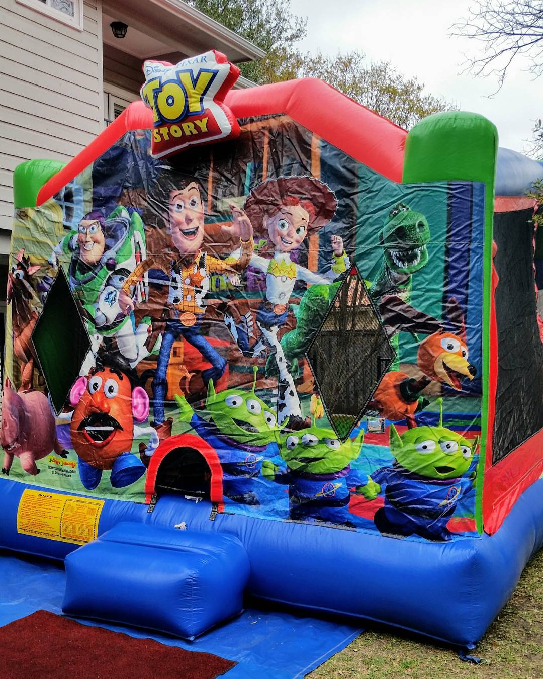 The Toy Story 4-n-1 combination unit offers an exciting mix of the classic characters — from Buzz and Woody, while also featuring some of the newer characters — like Lots-O the bear. Kids will spend hours enjoying this interactive unit, which includes a jumping area, basketball hoop, climbing wall, and slide. Officially licensed by Disney, this unit is sure to dazzle guests of all ages, with its beautiful customized Toy Story banner that covers the entire 15 foot front side of the unit. The Toy Story combination unit is perfect on a hot Texas day as it can be rented wet or dry, allowing kids to stay cool in the Texas heat. The Toy Story jump-n-slide is a terrific addition to any kids birthday party, backyard party, church event, or block party. Call Lena at 972-899-0135 to reserve now or fill out the form on this page!
