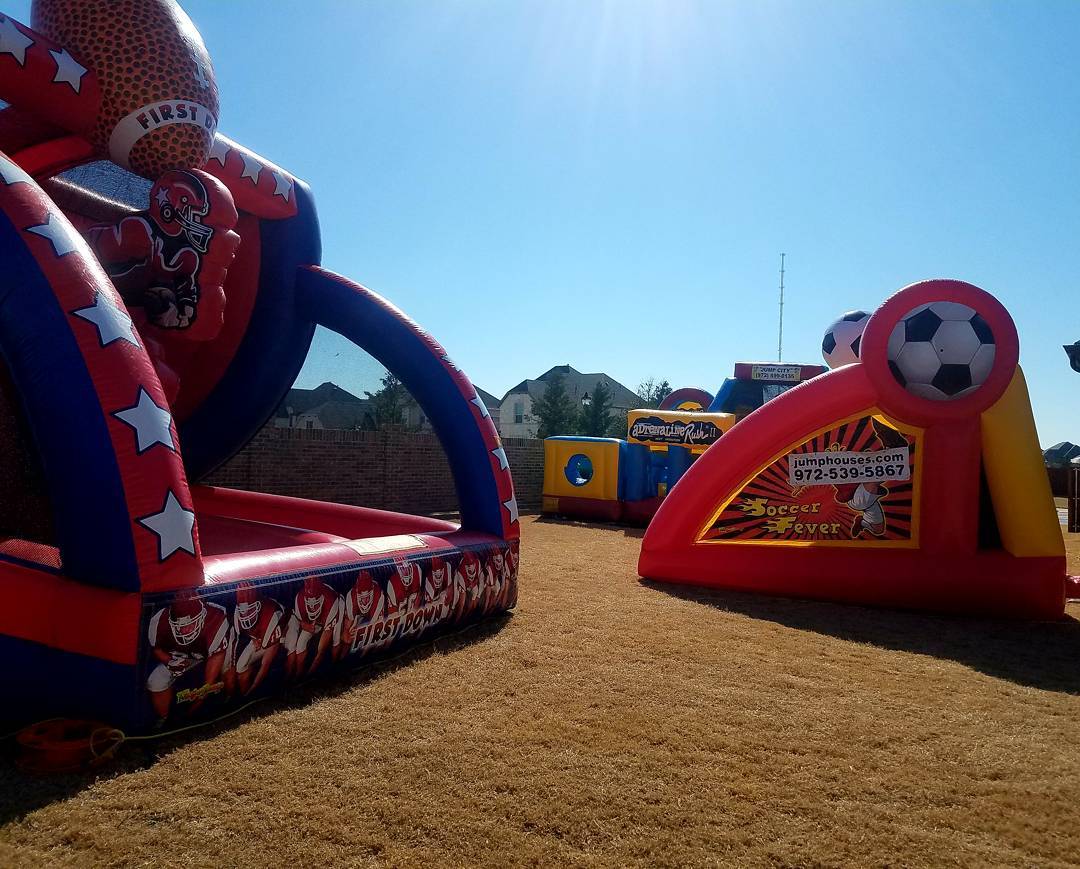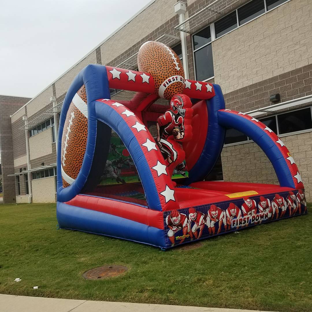 Jump City’s Football Challenge two lane Football Toss Inflatable Game! Players will be lining up to take their shot at the dual targets, which allow for plenty of action, fun and competitive spirit as players fire it in with mini footballs. This inflatable football game is designed on both sides to look awesome. A red, white, blue and yellow color scheme will match any party theme. We can have this Sporting attraction at your home or event in our extensive delivery area including Plano, Lewisville, Dallas, and many other cities.